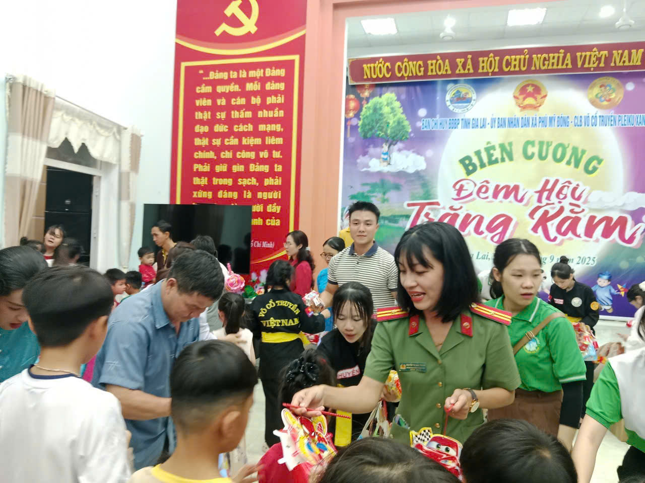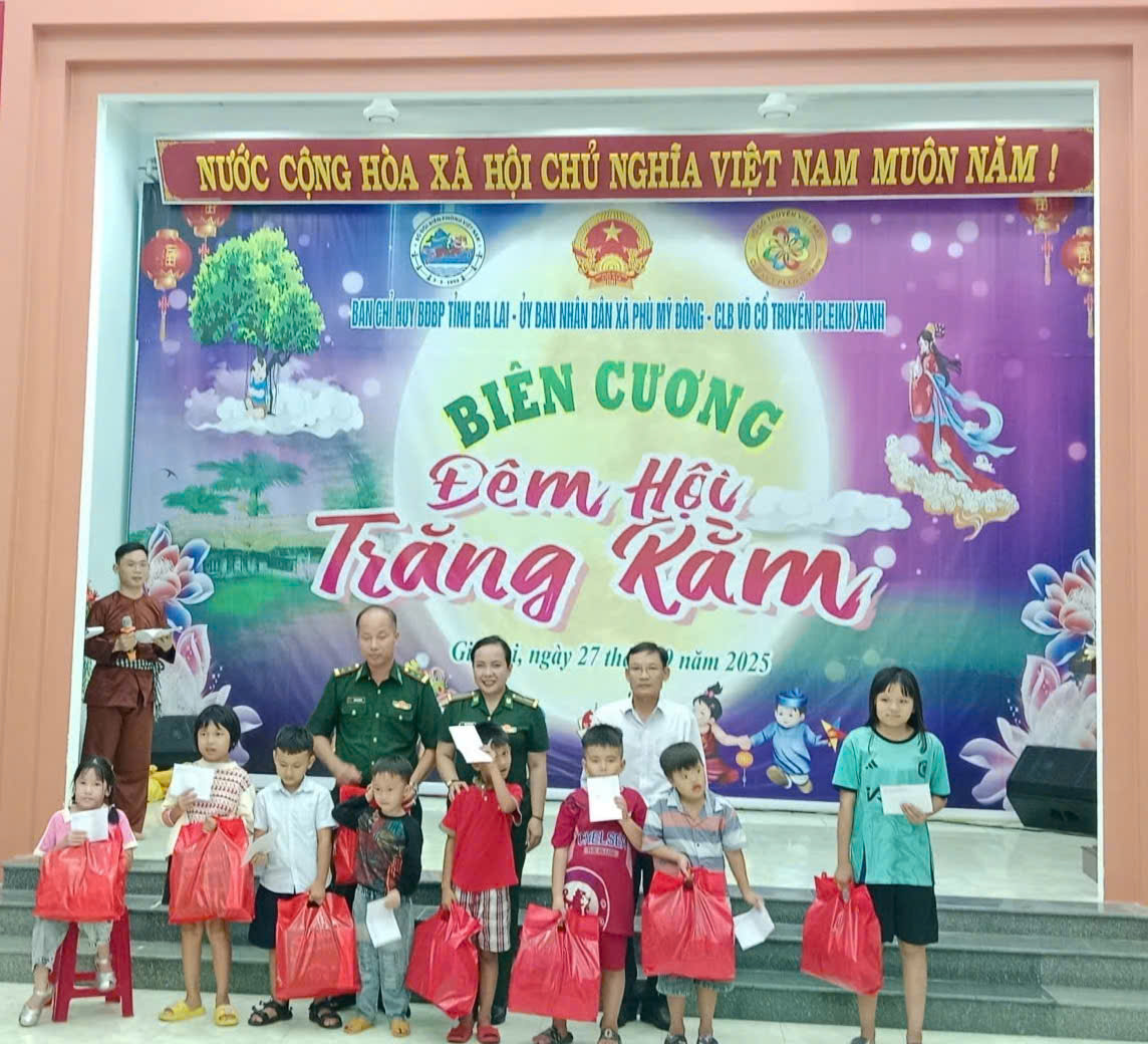 Đến với chương trình "Biên cương vui hội trăng rằm" năm 2025, các cháu thiếu niên, nhi đồng và người dân xã Phù Mỹ Đông được hòa mình trong không gian ấm áp, được thưởng thức những tiết mục văn nghệ đặc sắc, cùng tham gia những trò chơi dân gian thú vị, ý nghĩa, trả lời các câu đố vui về sự tích chú Cuội cung trăng, chị Hằng, về ý nghĩa của ngày Tết Trung thu…. Đặc biệt, các em không chỉ được trải nghiệm không khí vui hội trăng rằm, mà còn vui mừng và hạnh phúc khi đón nhận tình cảm, các phần quà ý nghĩa từ những người lính mang quân hàm xanh, cấp ủy, chính quyền và những tấm lòng thiện nguyện gửi trao.