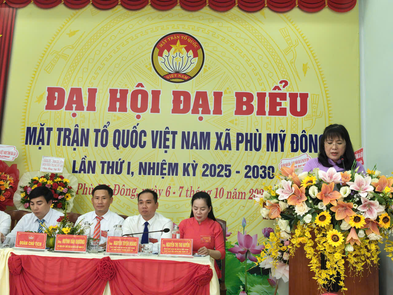 Phát biểu chỉ đạo tại Đại hội, đồng chí Trần Văn Phúc – Bí thư Đảng ủy, Chủ tịch HĐND xã và đồng chí Hồ Thị Kim Thu – Phó Chủ tịch UBMTTQ Việt Nam tỉnh đã đánh giá cao thành tích đã đạt được và đồng thời đề nghị trong nhiệm kỳ mới (2025-2030), UBMTTQVN xã cần tập trung vào các nhiệm vụ trọng tâm: T iếp tục tập trung tuyên truyền, vận động nhân dân thực hiện tốt các chủ trương, đường lối của Đảng, chính sách, pháp luật Nhà nước, các quy định của địa phương. MTTQ và các đoàn thể cần đặc biệt chăm lo, bảo vệ quyền, lợi ích chính đáng của Nhân dân; giúp đỡ người nghèo, người có công, người có hoàn cảnh khó khăn; không để ai bị bỏ lại phía sau, đổi mới nội dung và phương thức hoạt động, nâng cao hiệu quả giám sát, phản biện xã hội. Xây dựng đội ngũ cán bộ Mặt trận bảo đảm số lượng, chất lượng, đủ phẩm chất, năng lực và uy tín đáp ứng yêu cầu nhiệm vụ. Triển khai đồng bộ các giải pháp nâng cao chất lượng giám sát, phản biện xã hội; Triển khai hiệu quả các cuộc vận động, phong trào thi đua yêu nước, góp phần xây dựng xã Phù Mỹ Đông phát triển toàn diện.